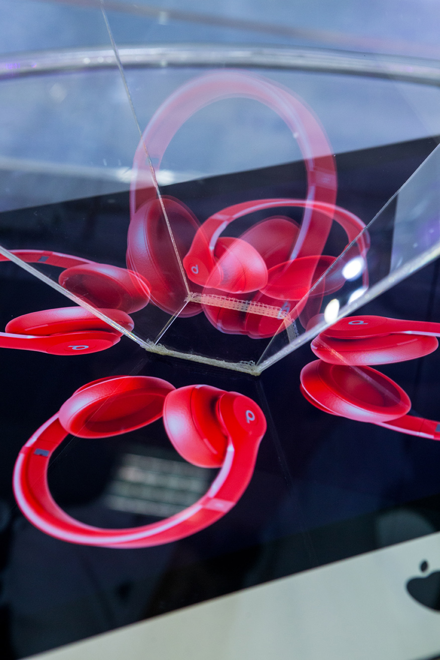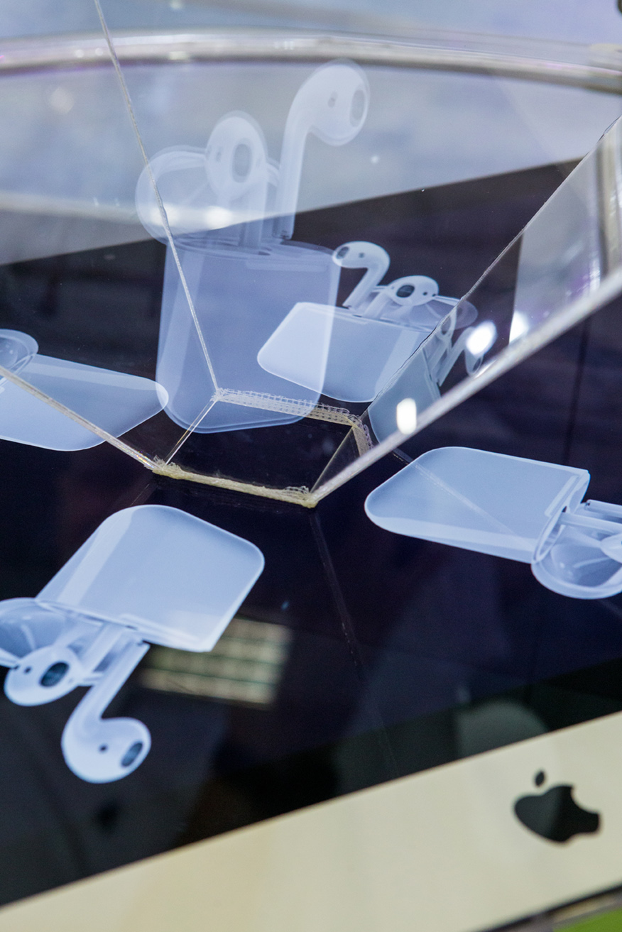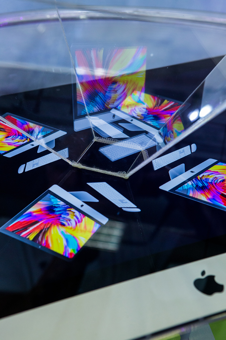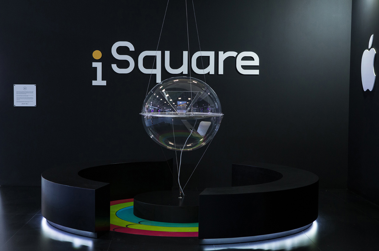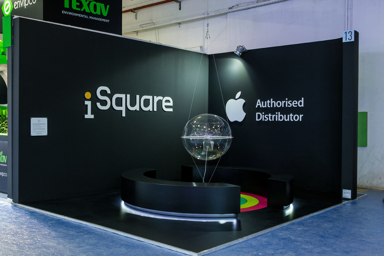 Το περίπτερο έχει κεντροβαρική διάταξη ώστε να επιτρέπει την ανεμπόδιστη, περιμετρική θέαση του έργου από τους διερχόμενους και τους επισκέπτες, ενώ στην περιφέρεια της κατασκευής οργανώνονται τα κυκλικά καθίσματα των επισκεπτών και οι προθήκες του προωθητικού υλικού. Με το εύρημα της ολογραμματικής αναπαράστασης, αξιοποιώντας μόνο την κορωνίδα των Apple προϊόντων, τον iMac, αναπαριστούμε όλα τα προϊόντα της εταιρείας απαντώντας στην πρόκληση των 13μ². Παράλληλα, η εργονομία της κεντρικής κατασκευής απαντά στην πρόκληση της ταχύτητας που απαιτεί η διοργάνωση, ενώ η φορητότητά της μας επέτρεψε να μεταφέρουμε την κατασκευή για μόνιμη έκθεση στο lobby των κεντρικών γραφείων της iSquare μετά το τέλος της έκθεση.