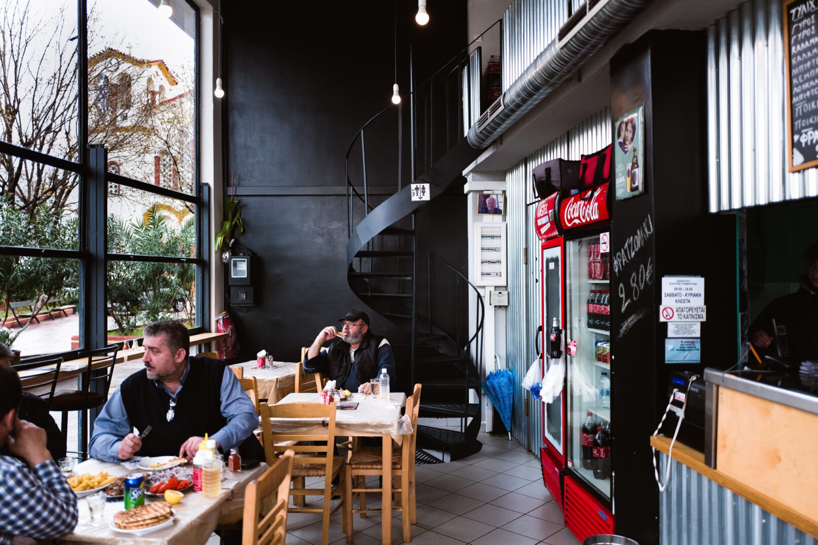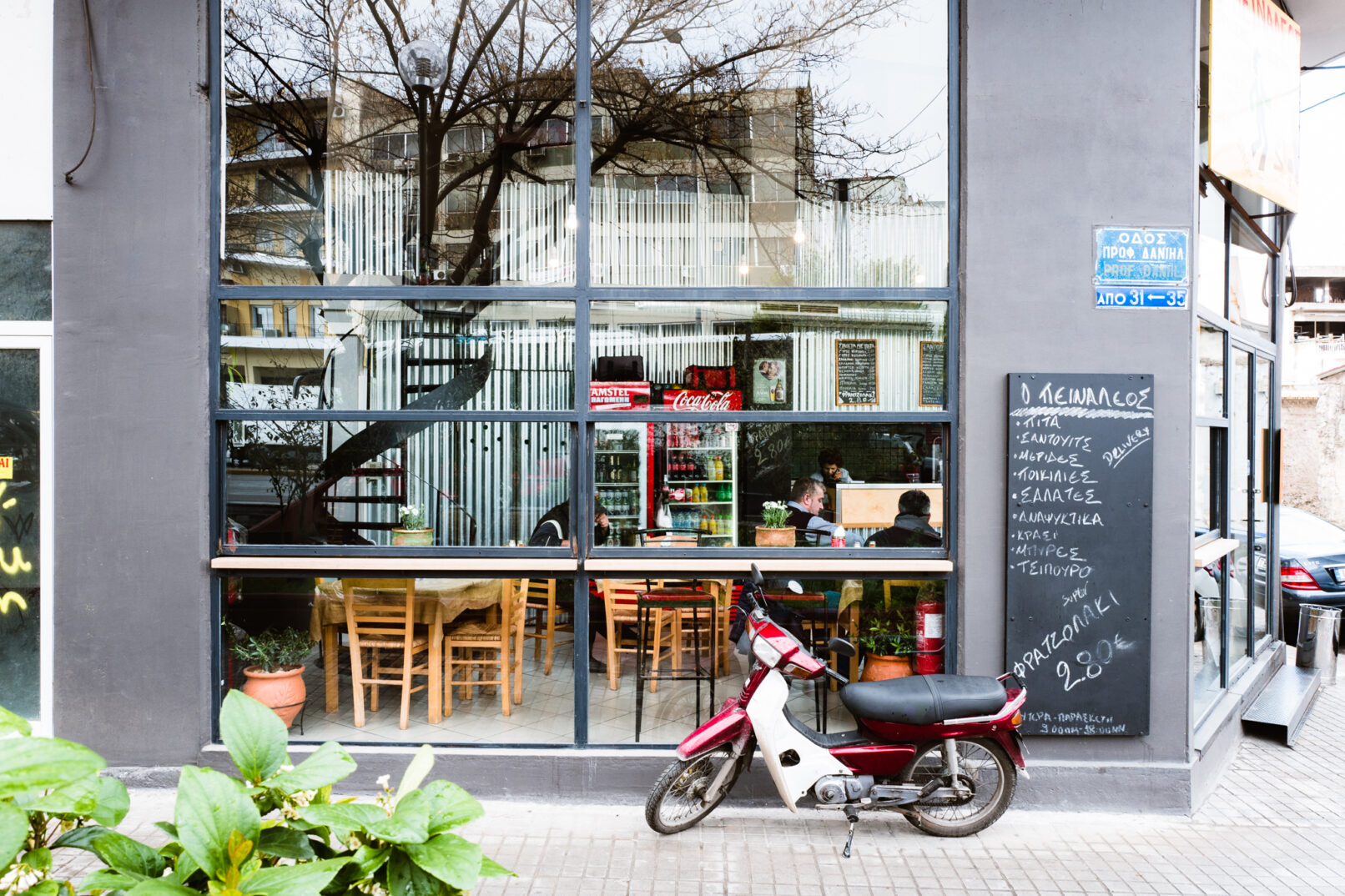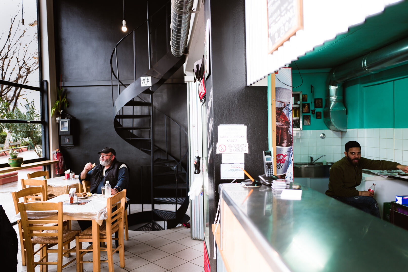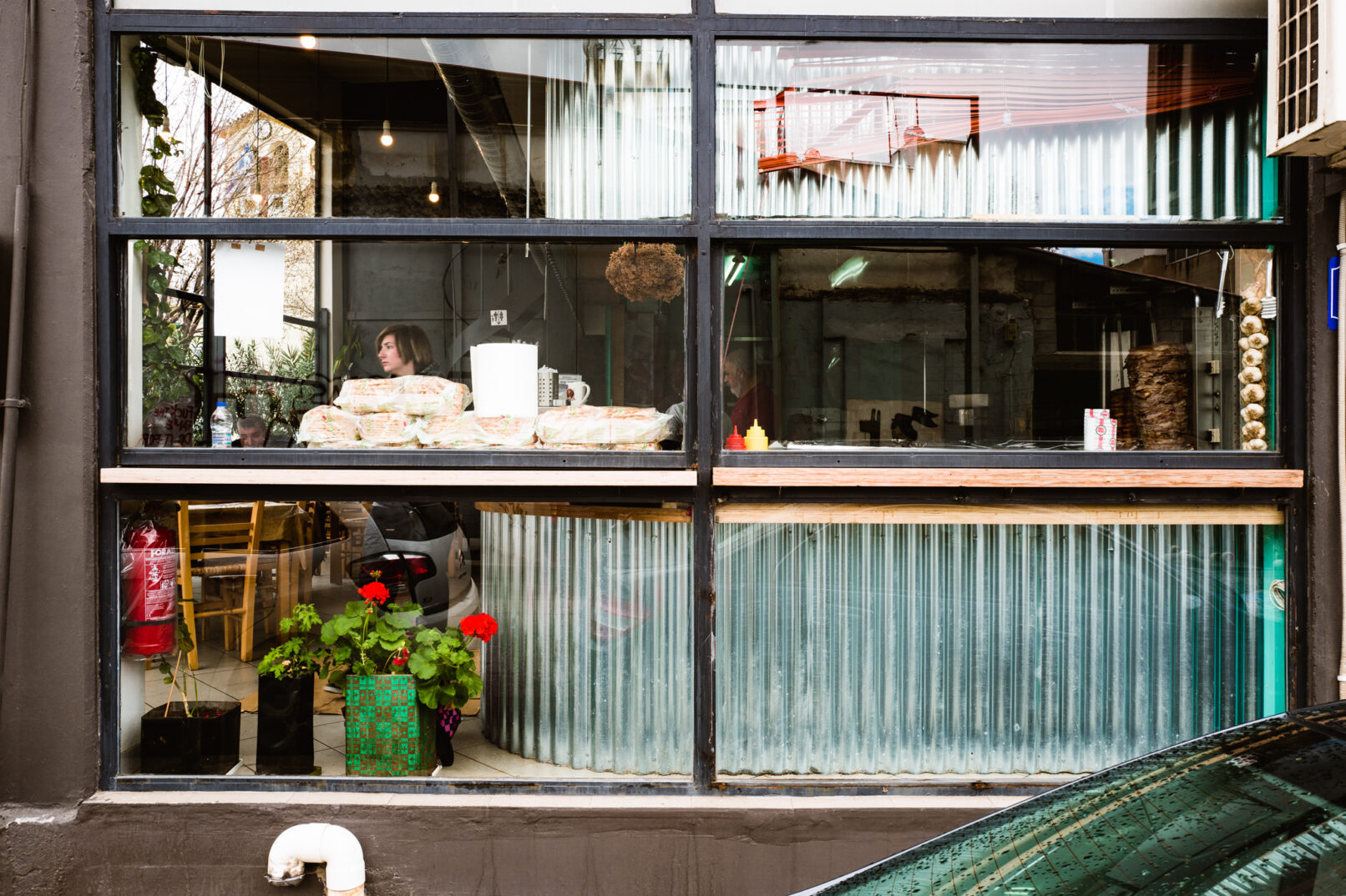 This ground floor store is located at Votanikos, the semi-industrial and vibrant neighbourhood of alternative communities and intellectuals. The unpretentious design integrates the past industrial character of the neighbourhood, incorporating the corrugated metal panels used at construction sites. To establish the new function of the eatery we created a curvy line to separate the dining area from the kitchen while maintaining the existing building shell. The spiral staircase which leads to the mezzanine was preserved and dominates the dining area. Large corrugated metal panels rise to the ceiling and are used to hide the kitchen and the preparation of the food. The facade is composed of large windows, which open above a two sided table where one can order food and enjoy a quick meal while standing outside the store at the pedestrian.