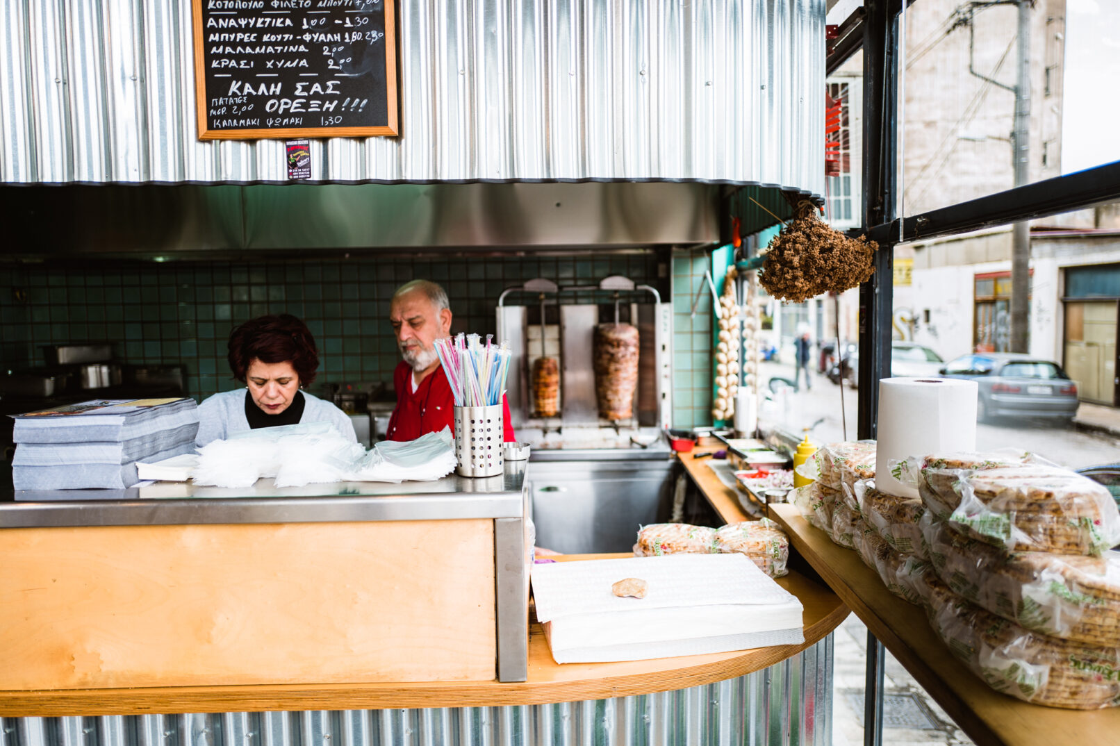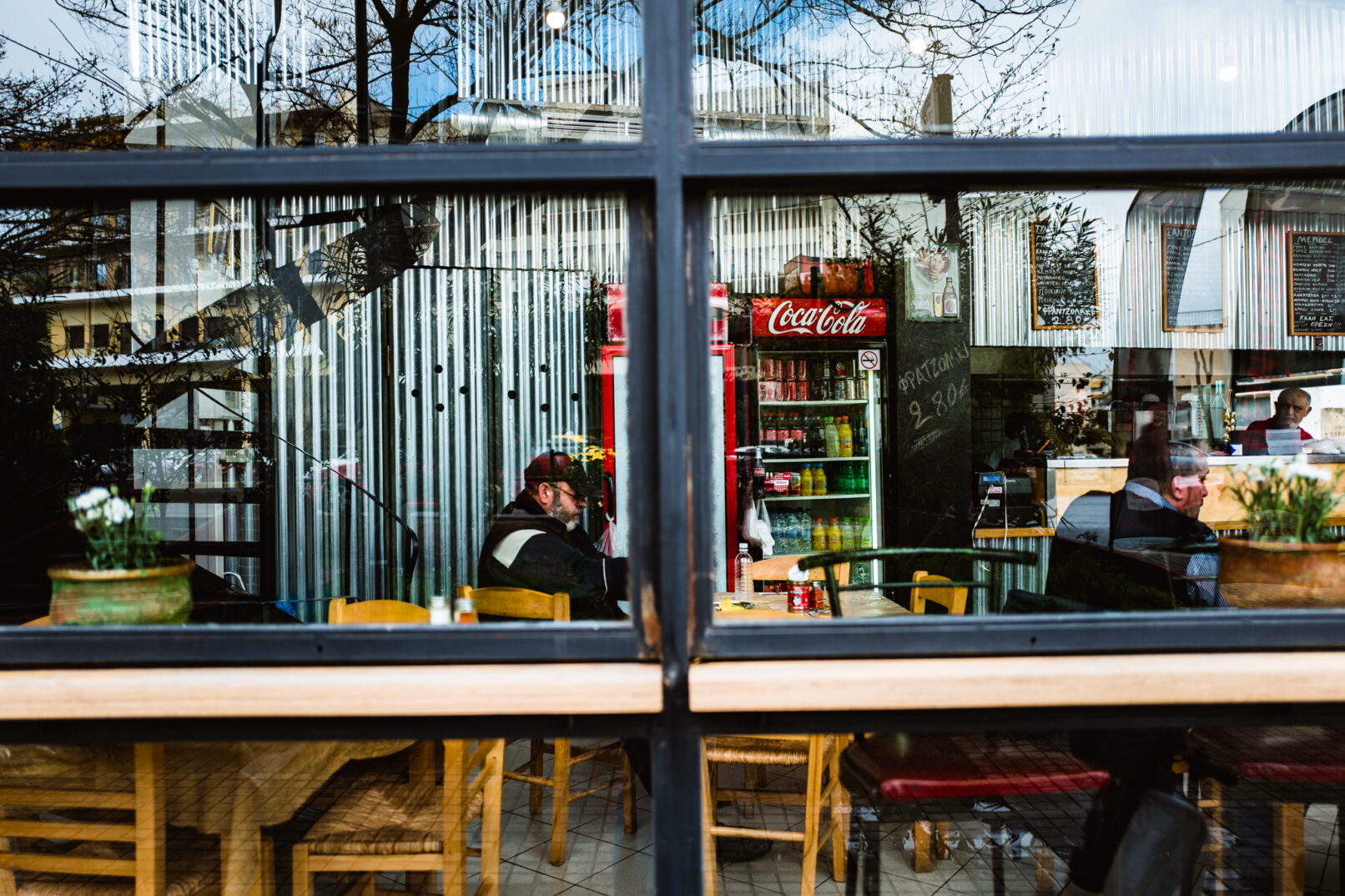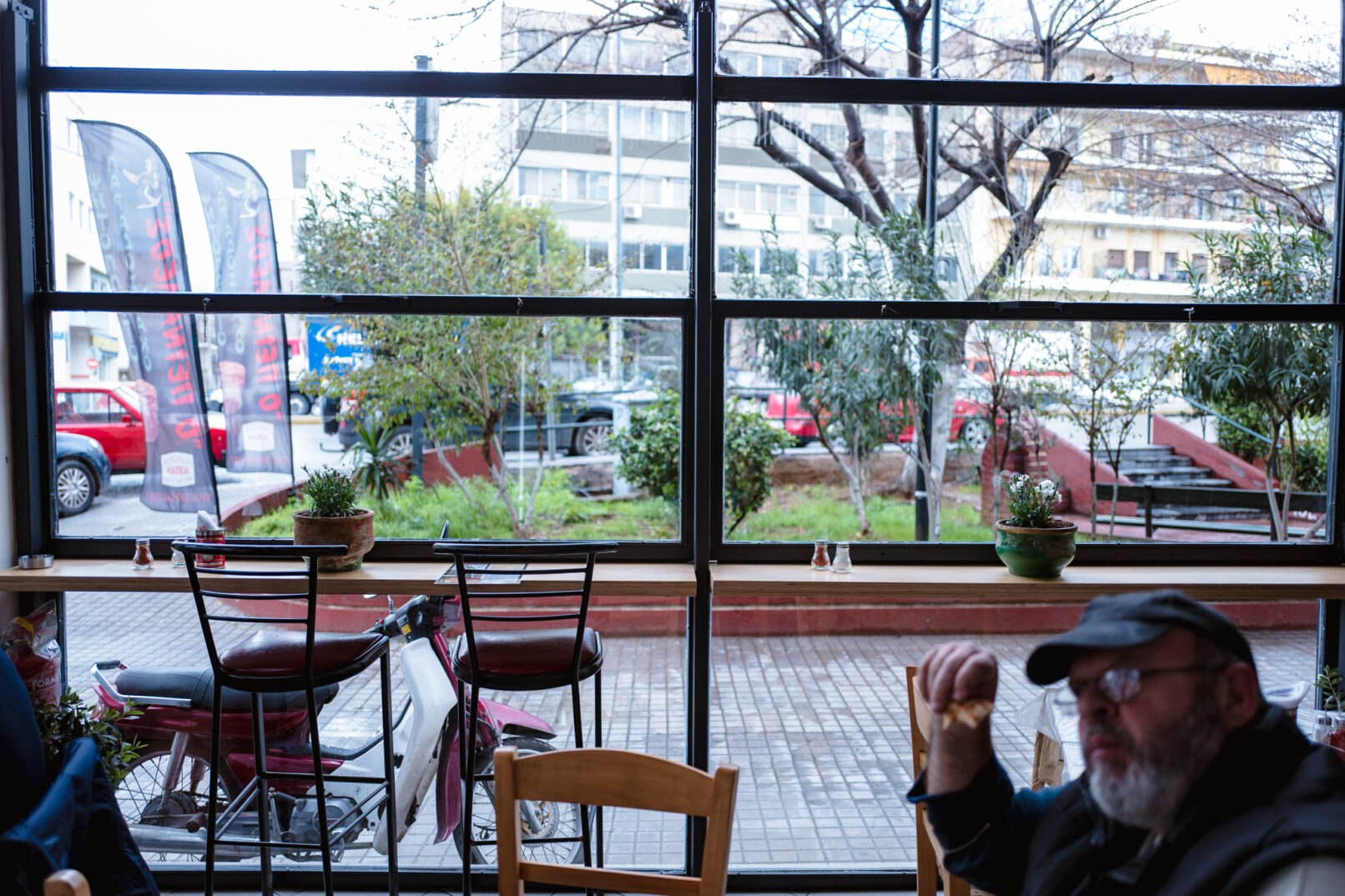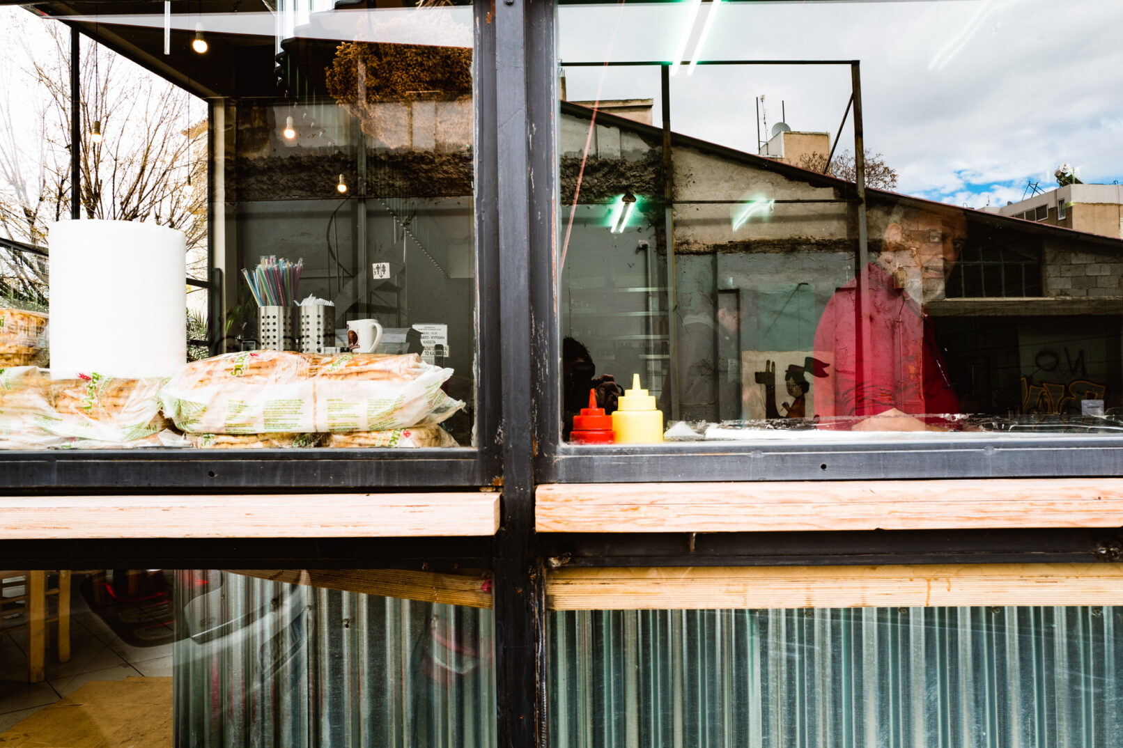 This ground floor store is located at Votanikos, the semi-industrial and vibrant neighbourhood of alternative communities and intellectuals. The unpretentious design integrates the past industrial character of the neighbourhood, incorporating the corrugated metal panels used at construction sites. To establish the new function of the eatery we created a curvy line to separate the dining area from the kitchen while maintaining the existing building shell. The spiral staircase which leads to the mezzanine was preserved and dominates the dining area. Large corrugated metal panels rise to the ceiling and are used to hide the kitchen and the preparation of the food. The facade is composed of large windows, which open above a two sided table where one can order food and enjoy a quick meal while standing outside the store at the pedestrian.