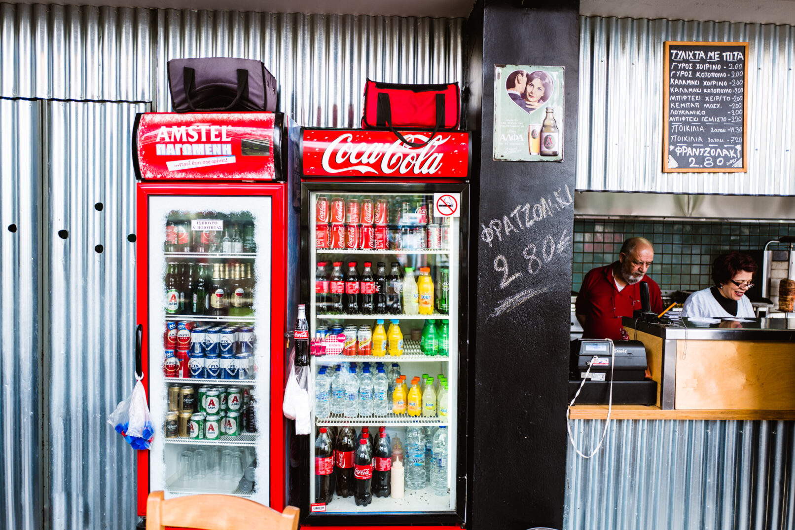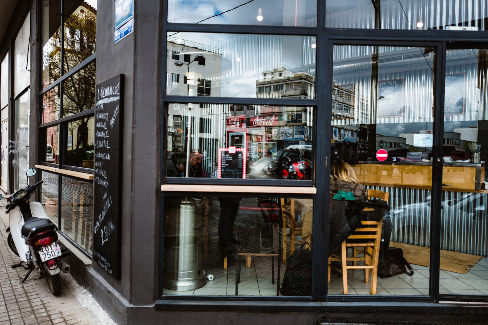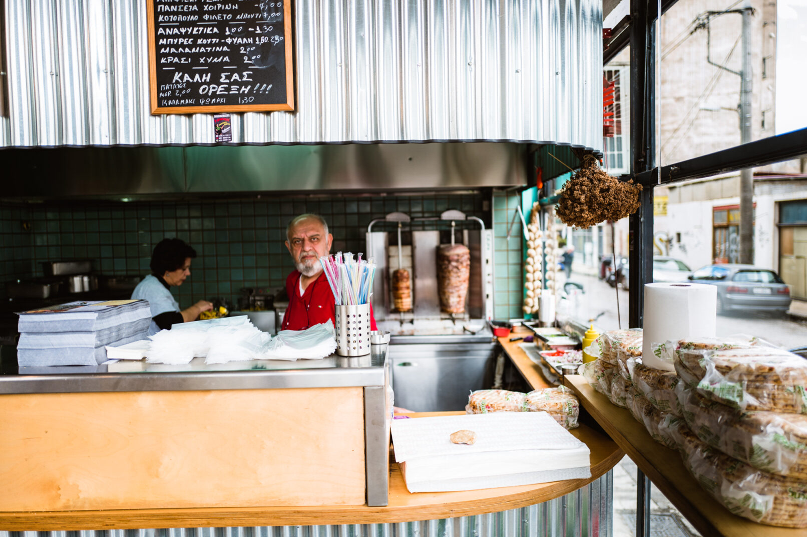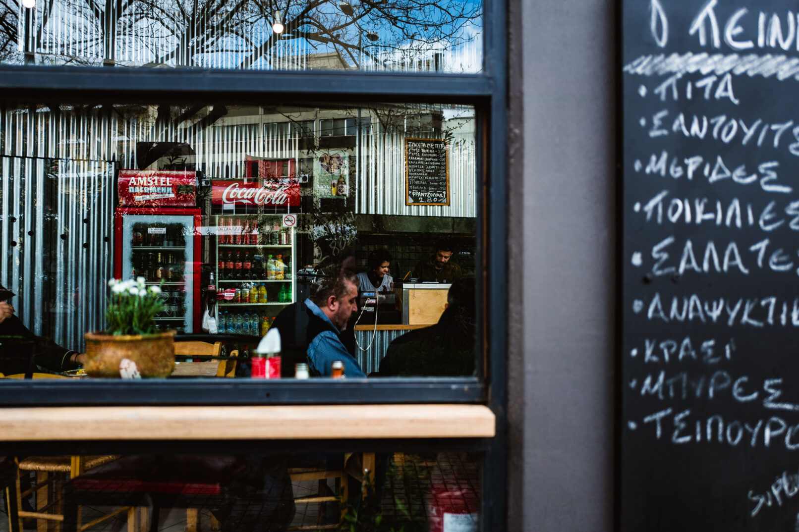 This ground floor store is located at Votanikos, the semi-industrial and vibrant neighbourhood of alternative communities and intellectuals. The unpretentious design integrates the past industrial character of the neighbourhood, incorporating the corrugated metal panels used at construction sites. To establish the new function of the eatery we created a curvy line to separate the dining area from the kitchen while maintaining the existing building shell. The spiral staircase which leads to the mezzanine was preserved and dominates the dining area. Large corrugated metal panels rise to the ceiling and are used to hide the kitchen and the preparation of the food. The facade is composed of large windows, which open above a two sided table where one can order food and enjoy a quick meal while standing outside the store at the pedestrian.