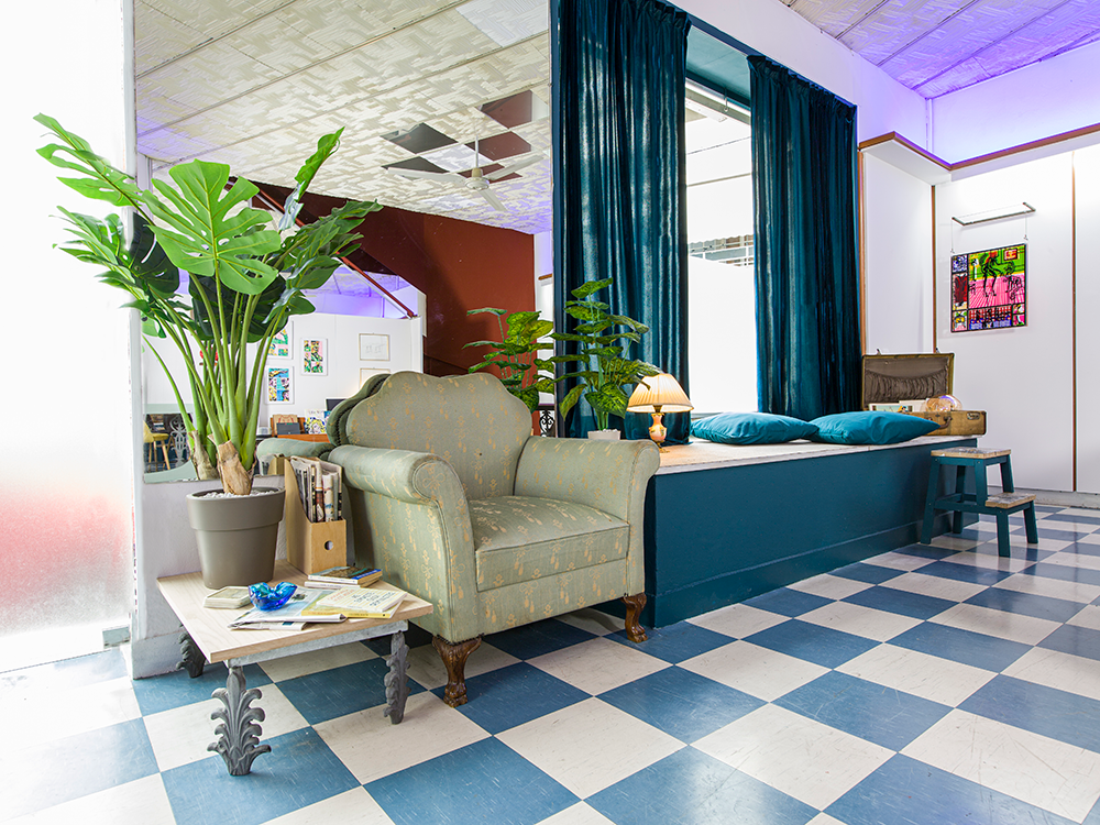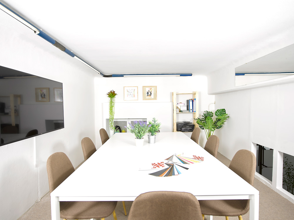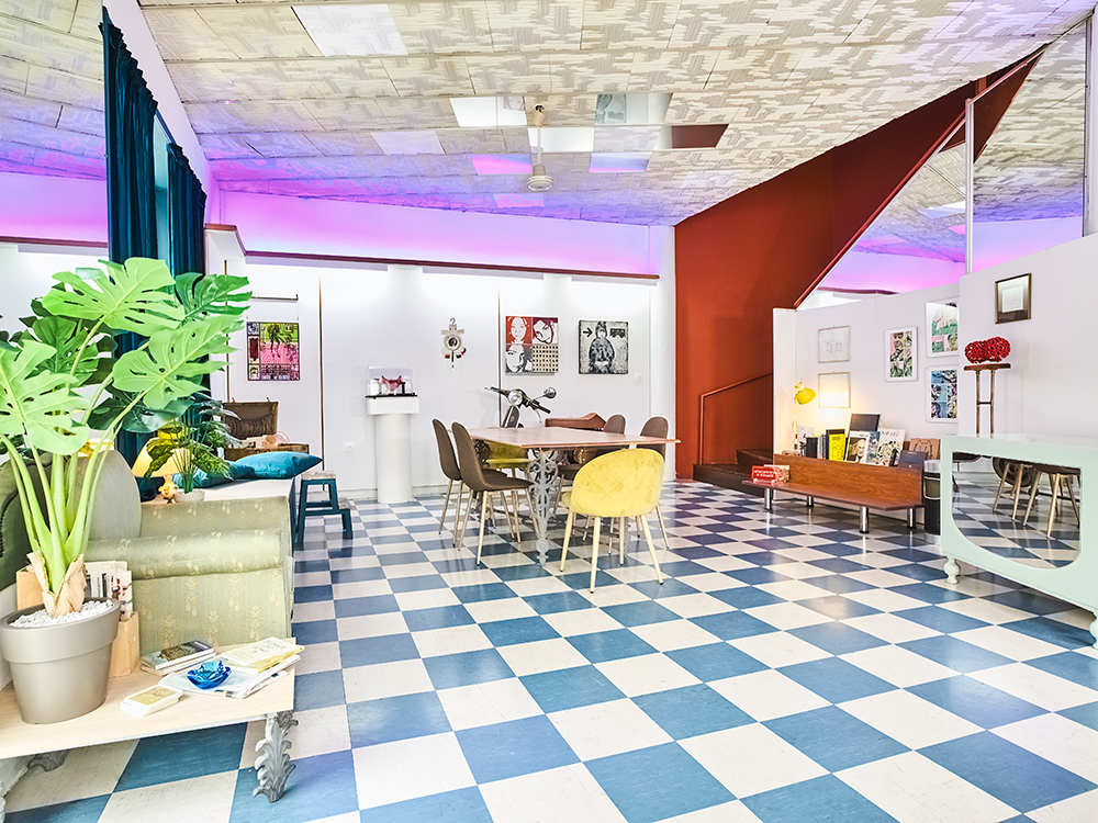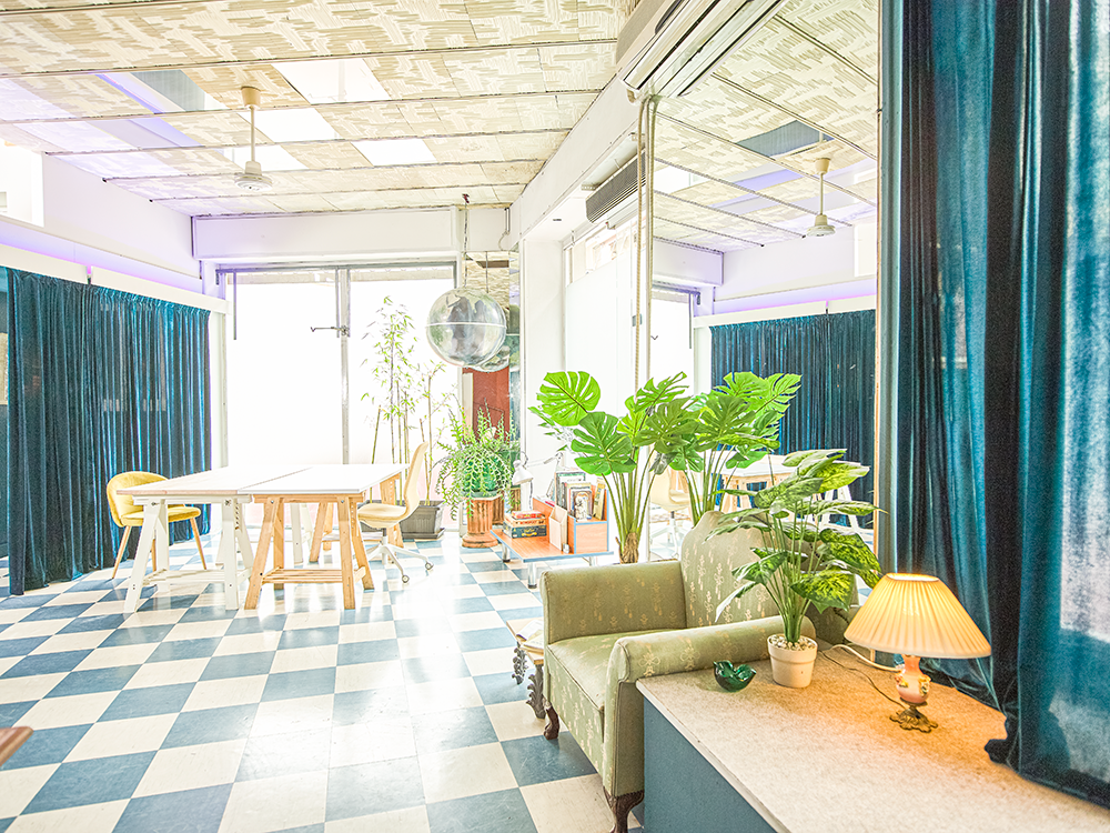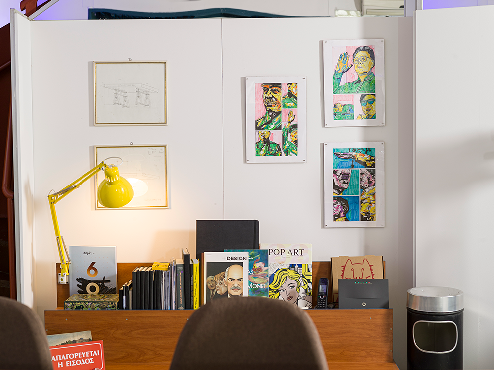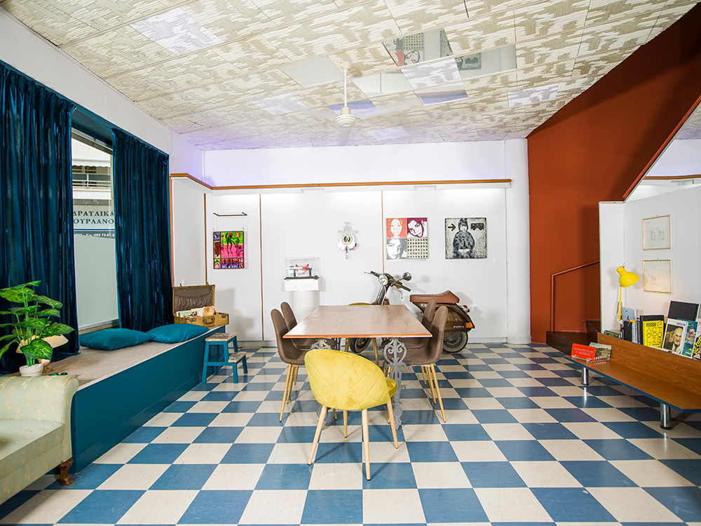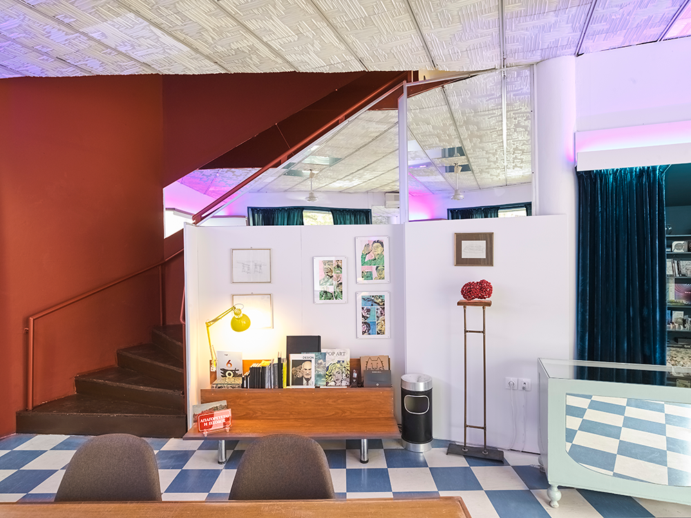 Reelhub Project is a synergy of people working in creative domains and it is located at a 100m² ground floor in Academia Palatonos. In this working class area of low houses we envisioned a space to create and host transcendental architectural and art projects. The large sign of the glorious era of VHS in its facade with the colorful rainbow is preserved as a tribute to the video club “Aquarius” that pre-existed. The retro elements of the video club are carefully revived to create frames in the interior, inspired by the aesthetics of that time. A fusion of 80s retro elements and the minimal white of the meeting room, are combined with a David Lynch cinematic style, which emerges from the small theater area. Past shelves for DVD & VHS are now showcases for artworks and bookshelves. Past magenta fluorescent lamps have been replaced with led ones and the older suspended ceilings were maintained also. We framed the blooming plane tree right across the street to create an interior setting for those working at the central hot desk. Display stands in the perimeter of the space host periodic exhibitions of our artistic community, sculptures, installations and paintings. Reelhub, which means the spindle of the tape, stands for the bonding between creative forces that emerge from our rich cultural present and memories.