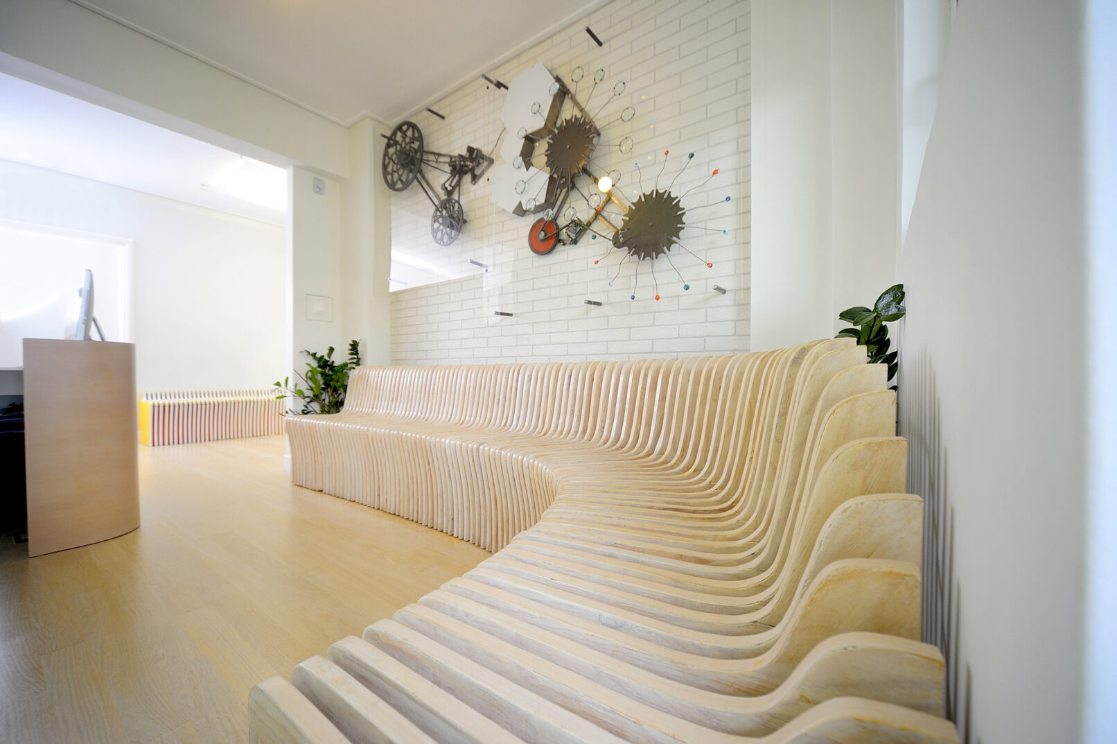 Kidcare Pediatrics an architectural challenge of creating a health space suitable for the harmonious accomodation of the pediatric and ophthalmology practice. The interactive installations at the waiting area are designed around the children’s need for sensory stimuli. We took advantage of the learning opportunities through experimentation, while at the same time we winked at the parents, awakening memories of their childhood. The parametric design of the waiting area, reminiscent of backbone, refers to the rod of Asclepius, which is widely used today as a symbol in medicine and health care services.